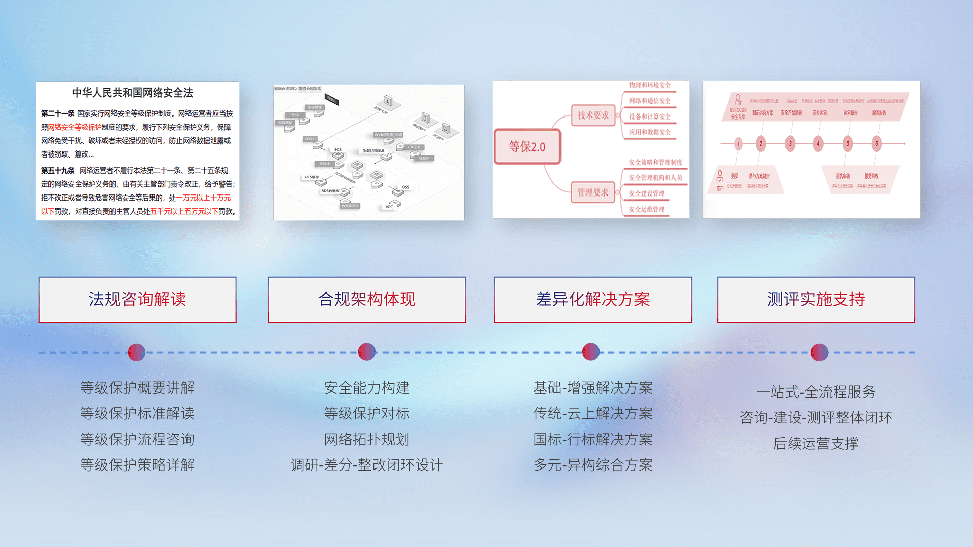 通过专业的法律咨询解读、、、合规架构体现、、、、差异化解决方案、、、、测试实施支持等服务,,,,为客户量身打造等保合规体系。。。。